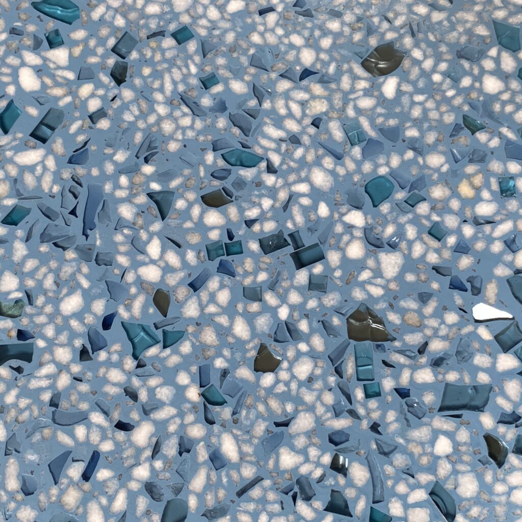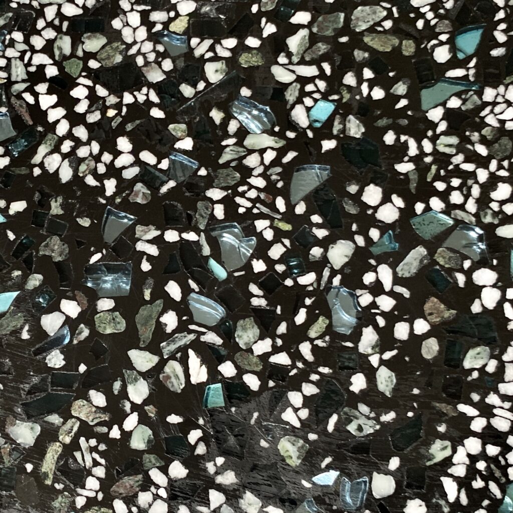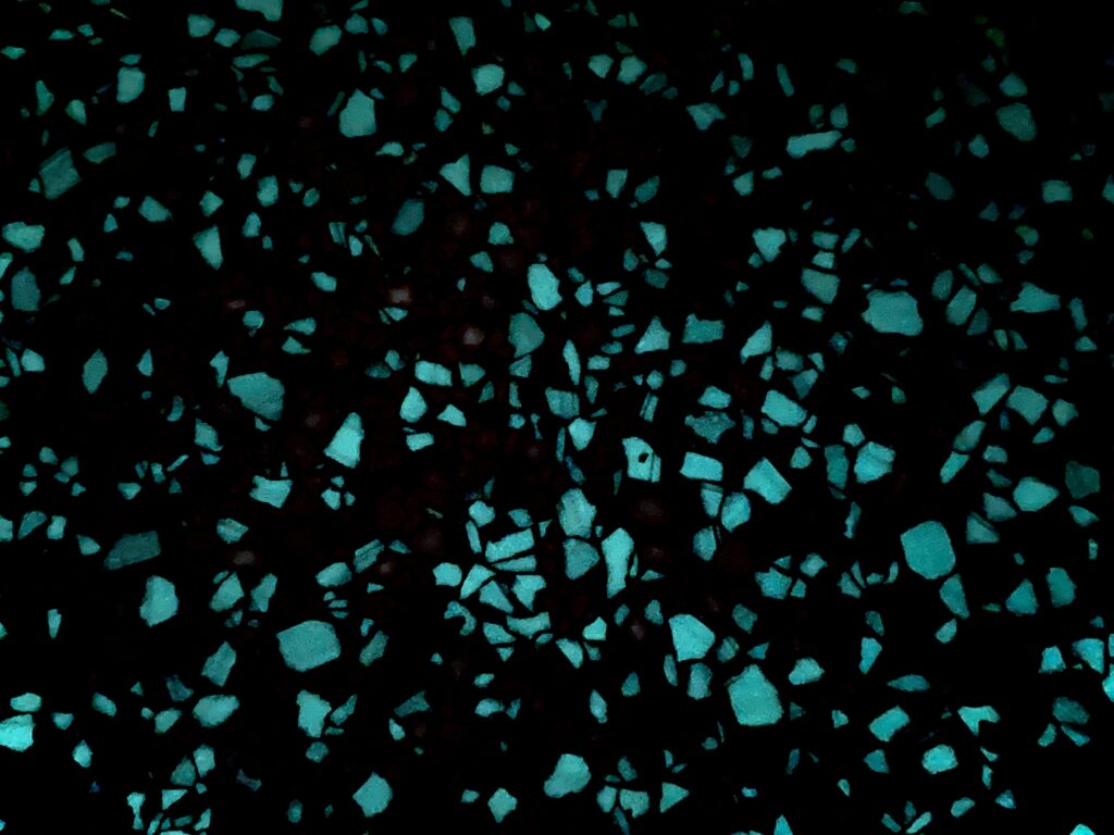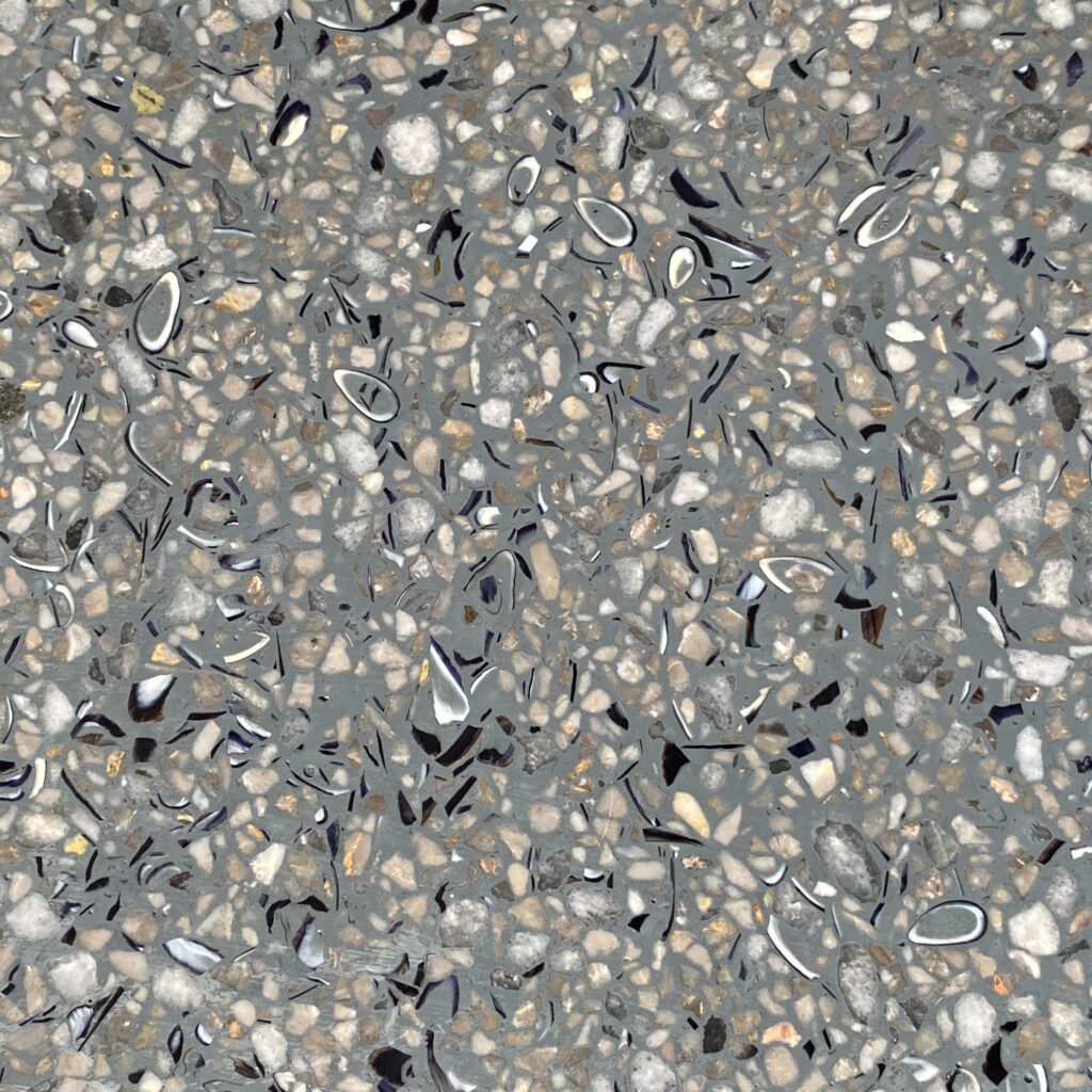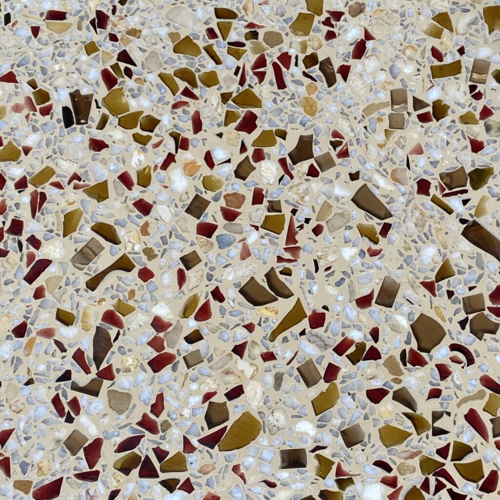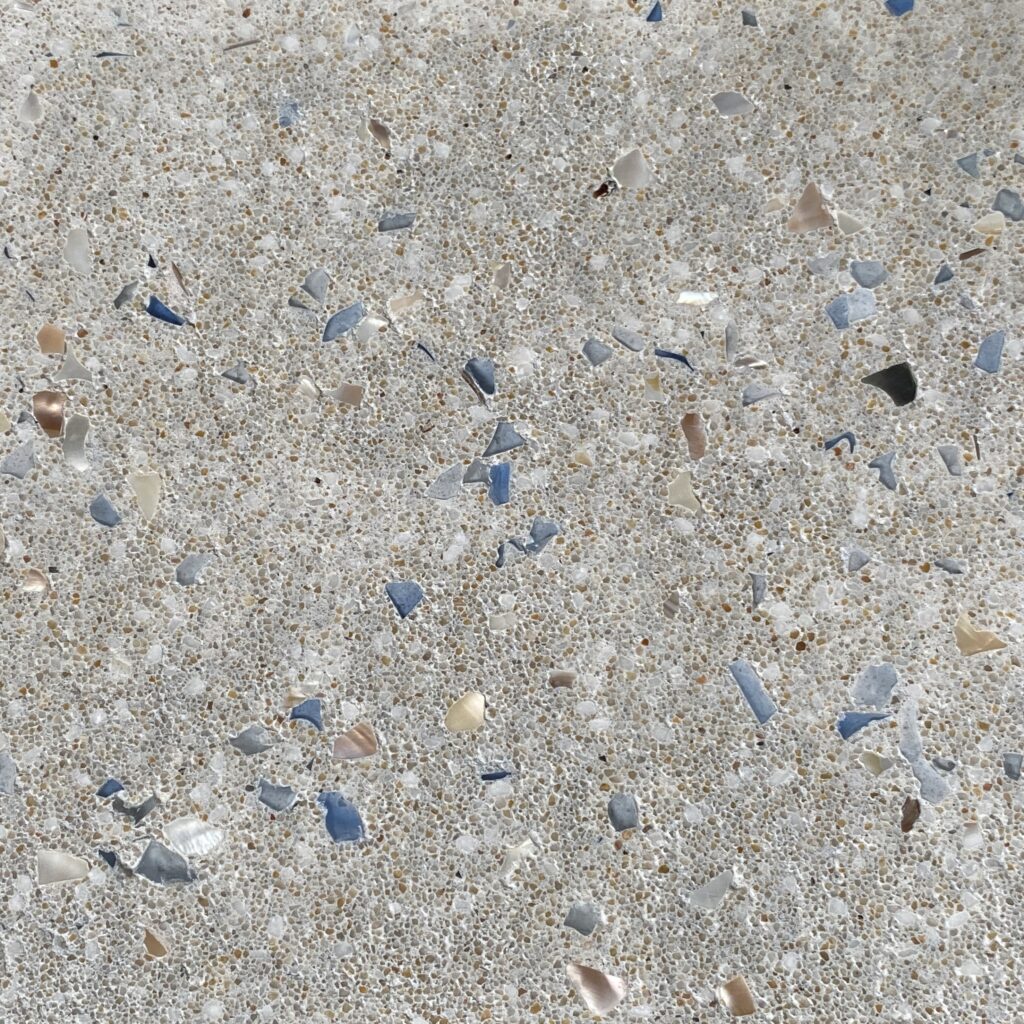 Des verres pilés colorés, des verres réfléchissants mais également de la matière organique comme des coquilles de moules et du nacres d’huitres permettant un recyclage de ces dernières.
